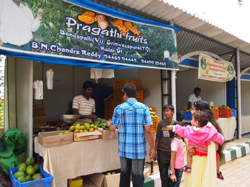 さて、カルナタカ州各地から集まった数十の農家の露店が並ぶなか、カメラ、ペン、メモ帳。ナイフ、おしぼりを構えての店巡りだ。