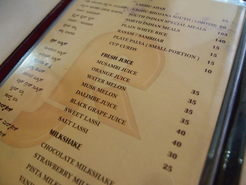 メニューには、カンナダ語と英語の2種類表記。DALIMBE JUICEという珍しいものを頼んでみたいと思うが、「ない」とのこと。