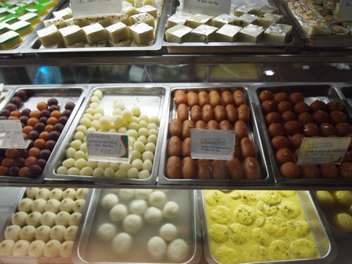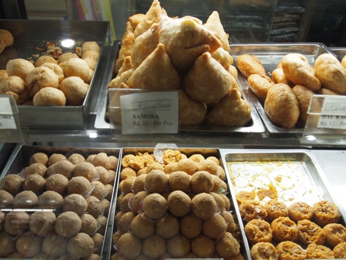 店内には、サモサなどの揚げ物系スナックの他、甘いお菓子類もヴァラエティ豊かに陳列されている。軽食類だけでなく、ターリーなど定食も食べられる。