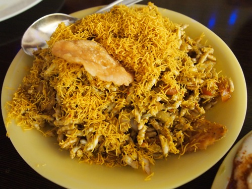 米菓子に、トマトやタマネギのみじん切りなどが混ぜられ、タマリンドソースなどで敢えたもの。