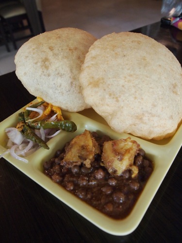 ひよこ豆(チャナ)を煮込んだものを、ふかふかの揚げパン(バトゥラ)と共に食す。からっと揚げられたバトゥラが、高カロリーっぽいが、美味である。