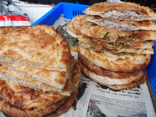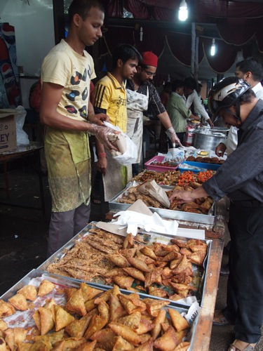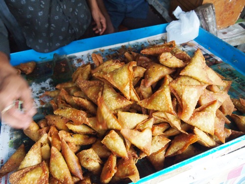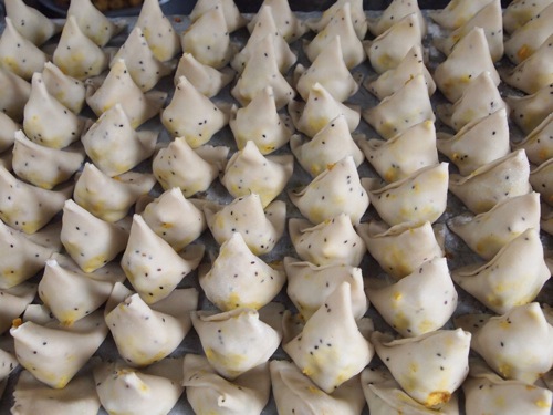 これは、サモサを揚げる前の図。具も、チキン入り、オニオン入り、ポテト入りとあれこれあるようで、見た目が同じでも味は微妙に異なるのだ。