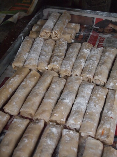 ペラペラに伸ばした小麦粉の生地で何かを包んで揚げ焼いているところ。何を包んだかは未確認。なにしろ、なみなみの油が見るからにデインジャラス。