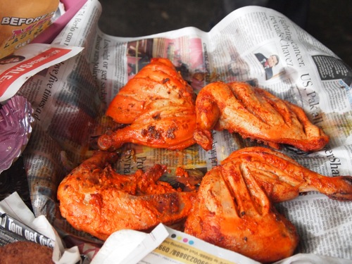 左上は、な〜んか見るからにおいしそうに見える揚げパン。高校時代の思い出のせいか。右上は鶏のもも肉。スパイスでマリネして、タンドールで焼いたもの。