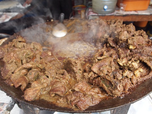 おっと、こちらの店にもハリームの看板が。が、先ほどとは違って、マトンとチキンのハリームが売られていた。が、右上の肉は、またしてもビーフ。ダイナミックに、おいしそう。