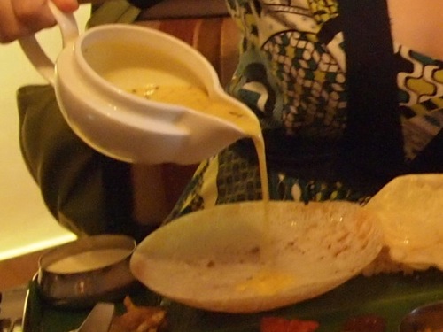 ちなみに、米粉&豆粉のアッパムは追加注文。円盤状のパンがそれだ。このアッパムに、ココナツミルクのホワイトカレー(まるでシチュー)を注いで食べるのだ。