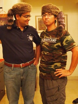 右上は「またぎ」な二人。U-KO隊員一家がアラスカ旅行に行った際の土産である。アライグマの帽子。マイハニー。被り物が、意外にお好きらしい。