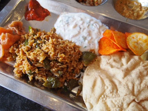 ミールスはカレー2種、炒め物、サラダ、揚げ物、パパッド、ライタ、ホームメイドのダヒ、主食にはプーリ、プラオ、白米。白米にはサンバルとライタ。そしてスイーツ2種と盛りだくさん!かなりのボリュームです。