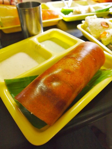 幸いなのは、このとおりサイズが小さめなこと。これはマサラドサ。故に、マサラ(複合スパイス)で調理されたジャガイモが巻き込まれている。