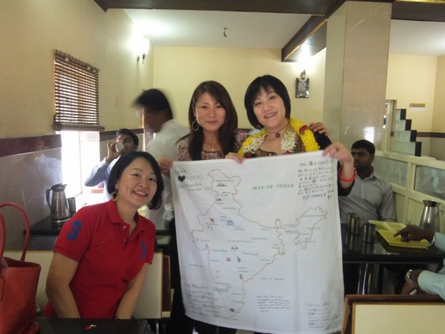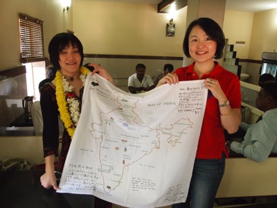 このインド地図が刺繍された布は、お別れの寄せ書きに好適なのだ。
