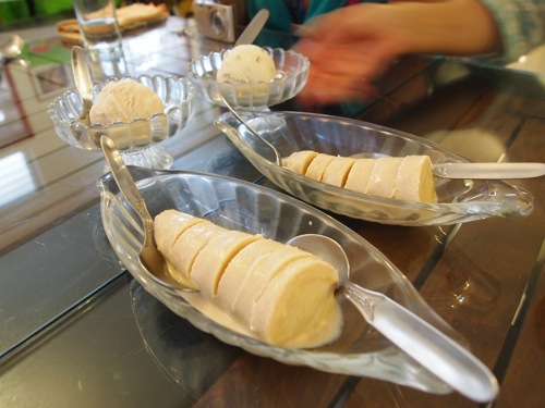 おなじみインドのアイスクリーム、クルフィのほか、イチジクとシナモンのアイスクリームを。どちらもさっぱりとミルキーでおいしい。ちなみにこれらもホームメイドだ。