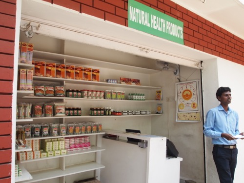 向かって右手が診療所、左手がレストランの建物になっている。レストランの入り口には、ハチミツや穀物などのオーガニック食品のほか、MEDIMIXというアーユルヴェーダの石けんが並んでいる。