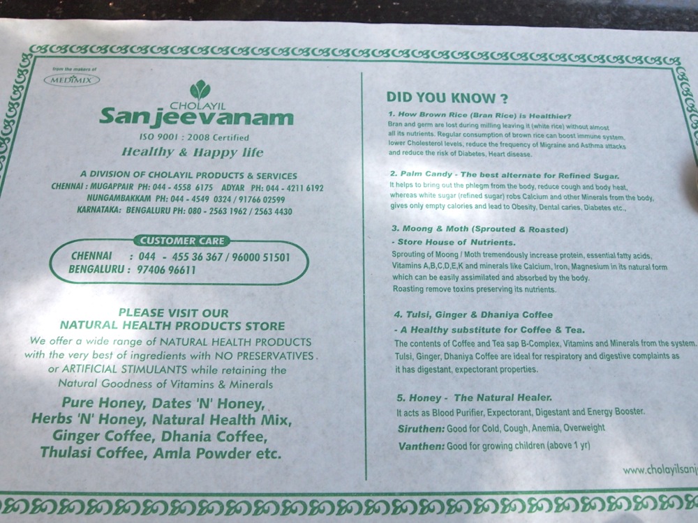 Sanjeevanamはチェンナイ拠点のホリスティックなヘルスセンター。このレストランはバンガロールには1軒しかないが、チェンナイには3軒もあるようだ。