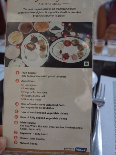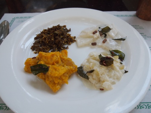 そしてついには主菜。メインディッシュ。ケララの赤米に各種野菜。ダル(豆の煮込み)やサンバル(辛みのある野菜たっぷりスープ)、ラッサム(これも辛みのあるスープ)など、なじみの南インド料理が並ぶ。