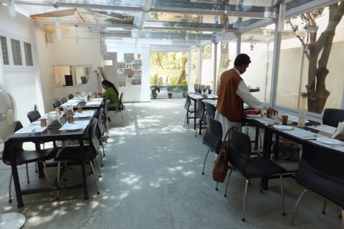 アーユルベーダの付属レストランと聞いていたので、もっと重厚でケララ風の暗い建物をイメージして行ったのですが、着いてみると、そこはテラスルームのようで、明るくお洒落な造り。