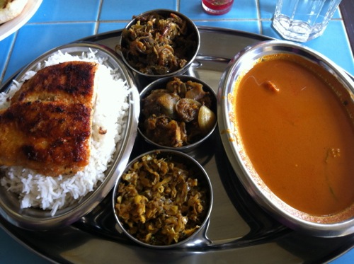 料理はシーフードターリー(定食)のほか、ポークとエビ、それぞれの前菜を追加注文。全体に味付けが濃くスパイシー。辛みを控えたい人は、その旨を伝えて注文するべし。