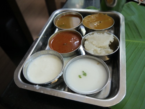 テーブルに敷かれたバナナの葉の上に次々とお豆や野菜のカレーやご飯が盛られ、それとは別に小さなカップにサンバル、ラッサム、2種類のスープカレー、バターミルク、ダヒ、スイーツが運ばれてきます。