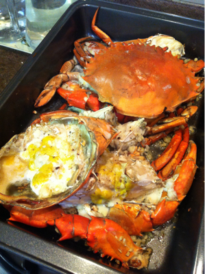 焼き上がってのち、見映えがするように、奥のカニは焼き上がって逆さまにした。