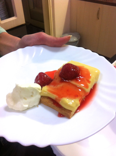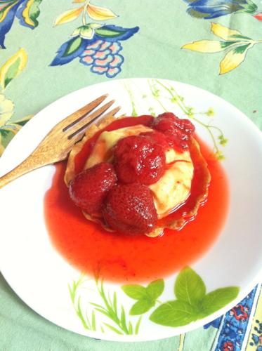 生クリームはないけれど、イチゴソースをたっぷりと。