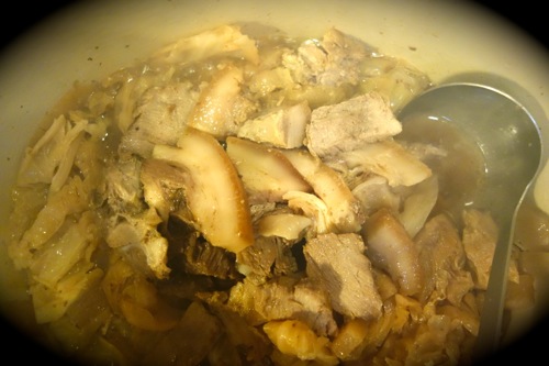 何もかもが柔らかくなったら、肉を取り出して切り分けて、再び鍋に戻す。その状態がこの写真だ。
