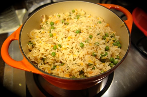 ピースご飯、を思い立ち、インドのバスマティ米で炊いてみることにした。香り豊かな長粒米。せっかくだから、少し旨味の強いものにしよう。玉ねぎのみじん切りをバターで炒め、そのあとに、ニンジンのみじん切りも加え、そして豆とお米を投入。茅乃舎の野菜だしをふりかけ、軽く醤油と酒をふりかけ、和洋折衷の風味にて。