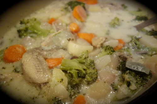 今夜はチキンのホワイトシチュー。玉ねぎ、ニンジン、ジャガイモ、ブロッコリー。そして丸ごと鶏肉を捌いたもの。あとは茅乃舎の野菜だし、バター、塩胡椒、牛乳で味付け。
