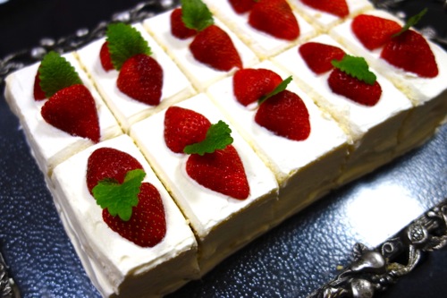 ロールケーキのレシピを応用。巻くかわりに2等分し、クリームやストロベリーをたっぷり挟んだ。形の悪いイチゴでも、おいしければ、それでいい。
