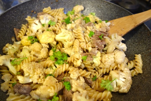 この日は残り物メインの夕食。茹でたカリフラワー、牛肉のグリルを炒めて「茅乃舎の野菜だし」をふりかける。程よく茹でたパスタを投入して味をなじませ、庭のパセリをまぶした。