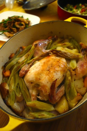 玉ねぎ、ジャガイモ、ニンジンを適当な大きさに切り、塩胡椒、オリーヴオイルをふりかけて混ぜる。その上に鶏肉を載せ塩胡椒し、ギー(もしくはバター)を表面に塗る。お腹にガーリックを詰める。