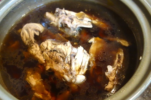 捌いた2羽の鶏肉。胴体周りの部分は「鶏ガラスープ」に。これは毎回人気の料理。まずは「鶏肉、生姜、塩」だけで茹でたスープを味見。灰汁を取りつつ、しかしほどよく脂が滲み出たスープは、それだけで美味。