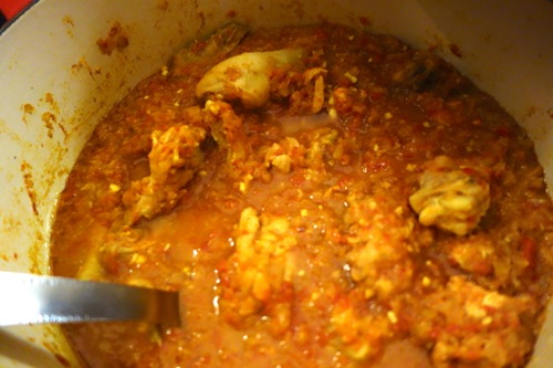 玉ねぎのみじん切りを油で炒めたあと、生姜、ニンニクのすりおろしを加え、キュミンパウダー、ターメリックパウダー、コリアンダーパウダー、塩を加えて練るように炒める。これにトマトのすりおろし(みじん切りでもよい)を加え、ひと煮立ちさせたあと、チキンを入れて煮込む。水は加えずとも汁気が出てくる。