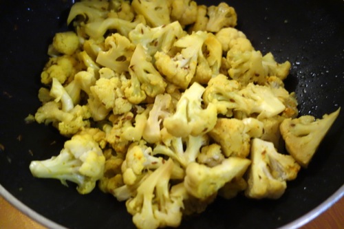 多めの油にキュミン(クミン)シードを入れて、軽くはぜさせ、いい香りが漂ってきたところで、カリフラワーを入れる。塩とターメリックをふりかけ、全体がきれいになじんだら、蓋をして蒸し焼く。焦げ付きそうだったら少し水を加える。超簡単。