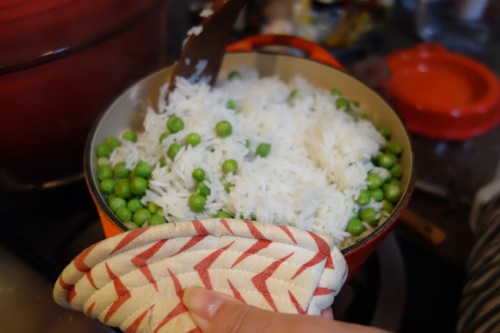 「包丁を持つのが苦手」という、普段は料理をされない駐在員男子のために、グリーンピーの殻を剥くというミッションを。オーガニックの豆は、毎度風味も濃厚で、バスマティ・ライスとの相性もよい。鍋で日本米を炊くのと同じように、炊く。鍋の大きさに対してご飯が多すぎて、混ぜにくいの図。