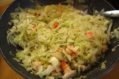 千切りしたキャベツは、茹でてもいいが、蒸し焼く方が簡単なので、蒸し焼きに。味付けは手軽に茅乃舎の野菜だしを袋を破ってふりかける。エビは別のフライパンで炒めたものを加えた。あとは軽く塩胡椒で味を整える。