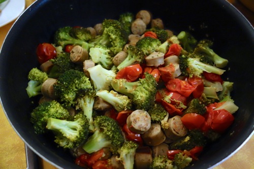 カリフラワーに並んで、ブロッコリーも身体が喜ぶ健康野菜。というか、野菜はどれも、身体にとって、いいものである。これも一口大に切り、オリーヴオイルを熱したフライパンに、お気に入りのポークソーセージ、そしてチェリートマトを入れて、炒める。軽く塩胡椒で味付け。調味料は最低限。素材の味に頼る。
