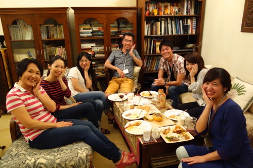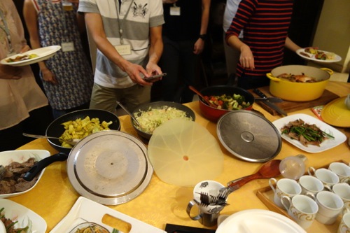 調理実習が終わったころ、親睦会のみ参加の方々も集まって、乾杯。毎度、我が夫が、乾杯を取り仕切る。普段は決して料理をしないのに、調理実習参加の男子にスパイスの効能などを熱く語るあたり、相変わらずである。