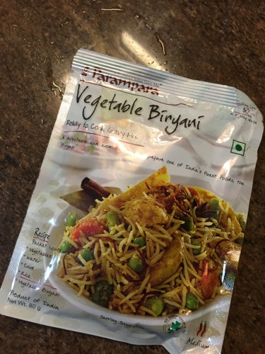 玉ねぎとニンニクをオーガニックの美味バターでしっかり炒めたあと、トマトを加えて炒め、洗ったバスマティライス、そして適量の水で溶いたビリヤニのスパイスミックスを加えて炊くだけ。