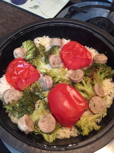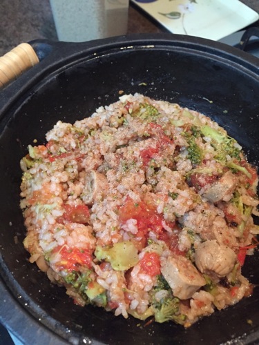 15分ほどで炊きあがる。この状態のものに、バルサミコ酢などをふりかける。そして、塩胡椒で味を整える。