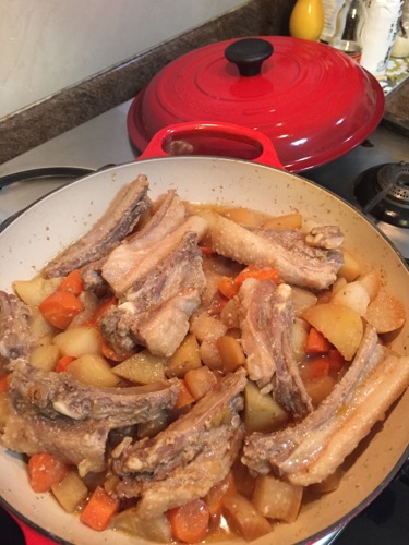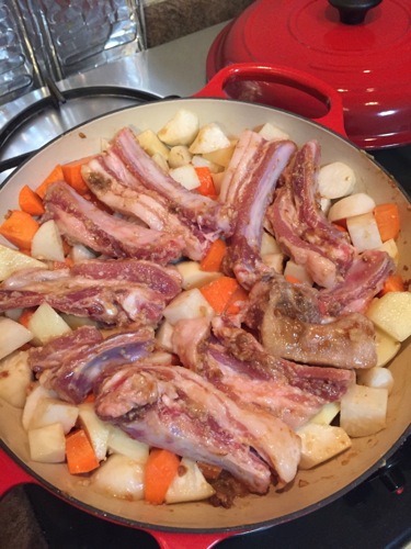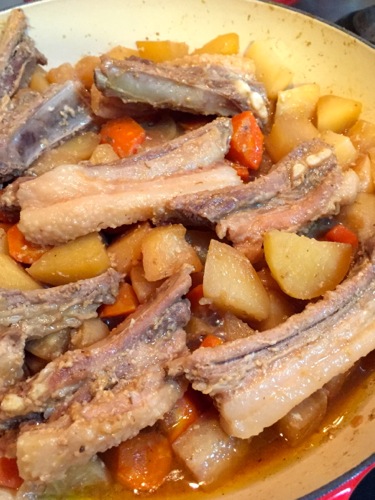 マリネしたスペアリブを上に載せ、焦げ付くといやなので、少し水を加えて蒸し焼く。