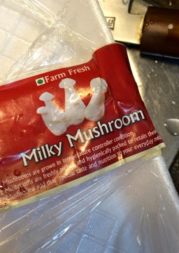 野菜店のNamdhari’sで、ときどき見かけるミルキーマッシュルーム。もう、何年も前からあるのだが、店頭に並ぶのは、気がむいたときだけ、という状況なので、見かけたら、買う。