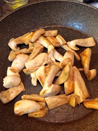 やや多めのオリーヴオイルで炒める。塩こしょうで味付けして、このまま食べてもおいしいのだが、この日はサラダのトッピングに。