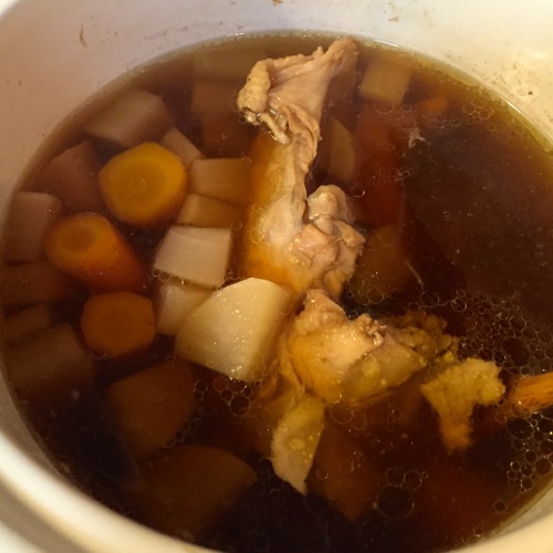スロークッカーに鶏肉(主に胴体の骨)とショウガ、水を入れて、数時間煮込む。その後、ニンジンと大根も加える。ヘルシーな薬膳風料理。