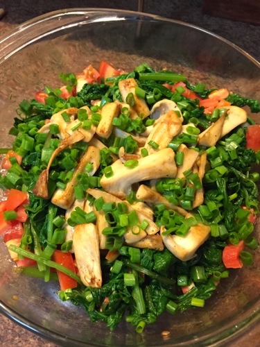 茹でたホウレンソウ、ザクザクと切ったトマト、ネギ、そしてマッシュルームを載せたサラダ。