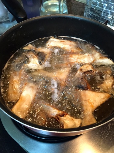 深底のフライパンで、マナガツオをフライにする。エアフライヤーを使わない、油にての、「本気のフライ」である。