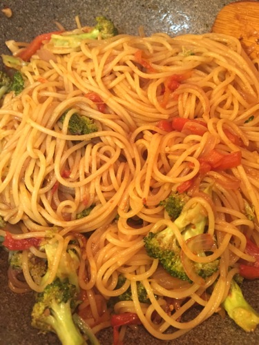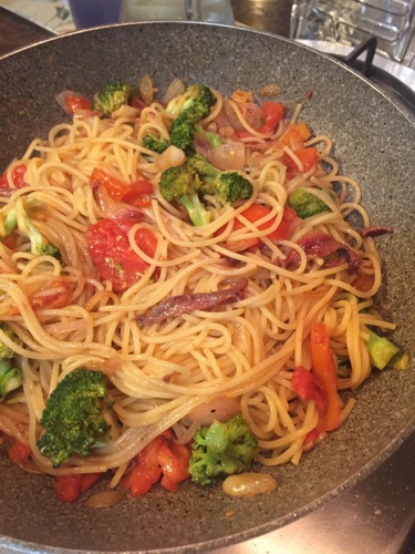 この日は、ぐいぐいと、味をしみ込ませたかった。この際、アンチョヴィの姿が消え去ったとしても。ゆえに、パスタを入れた後も、炒める。アルデンテ? 関係ないね。とばかり、炒める。