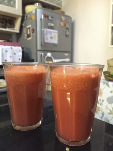 この日は、インゲンを蒸したものを添えた。毎日、ホウレンソウかインゲン、アスパラガス、ブロッコリー、ピーマンなどをローテーションしての「緑の野菜」が添えられる。トマトもまた常備。インドのトマトは酸味が強いので、加熱して食べることが多い。