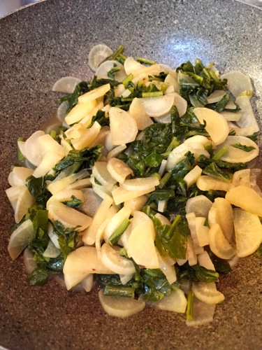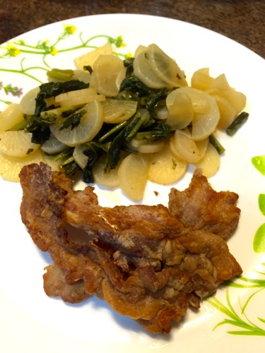 オーガニックの大根と大根葉の煮付け。それに薄切り豚肉を立田揚げ風に味付けて、エアフライヤーで調理したもの。