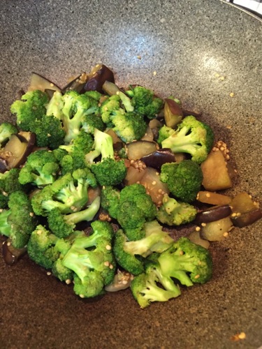オリーヴオイルと塩胡椒というさっぱりとした味付けだけれど、素材の旨味が濃縮されていて、おいしい。付け合わせの野菜は、ナスとブロッコリーの炒めもの。