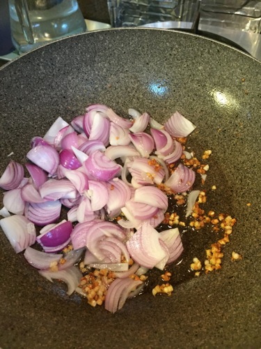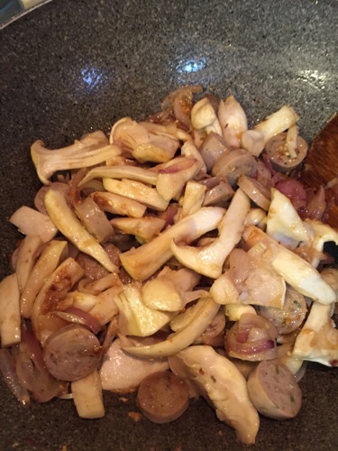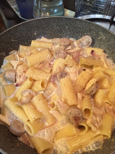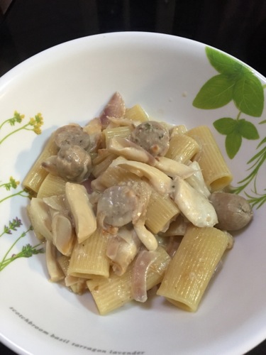 インドの玉ねぎは水分が少なく甘味が強いので、ガーリックとともにバターで炒めれば、風味豊かな調味料となる。この日はマッシュルームとソーセージを使い、牛乳と菓子作りで残っていた生クリームを入れて、硬めに茹でたパスタを煮込んだ。