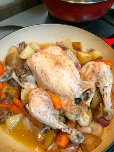 肉汁のしみ出したバター&オリーヴオイル、そしてガーリック入りの鍋で、玉ねぎ、ジャガイモ、ニンジンを炒め、再び鶏肉を加えて調理。